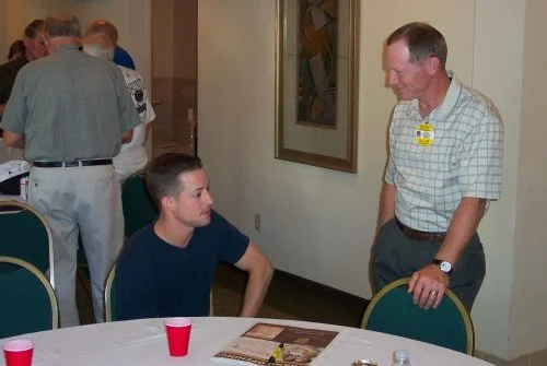 Korean era Jud Davis (L) and Bob Williams (R) with their Korean Squadron "Yearbooks" while Kirby listens.